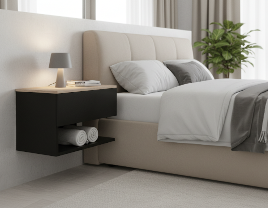 Dit strakke, zwevende zwarte nachtkastje is de perfecte minimalistische toevoeging aan uw slaapkamer. De hoogglans zwarte afwerking geeft een chique en moderne uitstraling die naadloos aansluit bij een design-bewust interieur. Dankzij de wandmontage creëert u een ruimtelijk effect en houdt u de vloer vrij, wat zorgt voor een opgeruimde look.